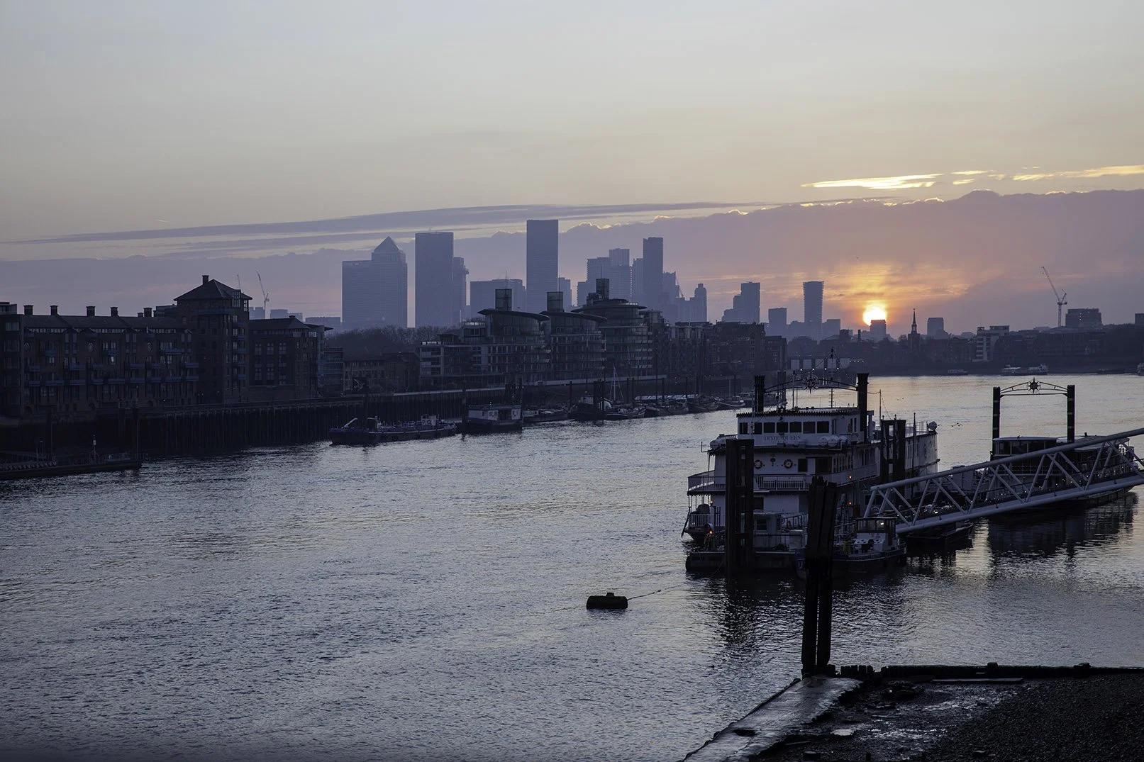 Here we’re looking downriver, with Rotherhithe on the right and the towers of Canary Wharf in the background on the left.